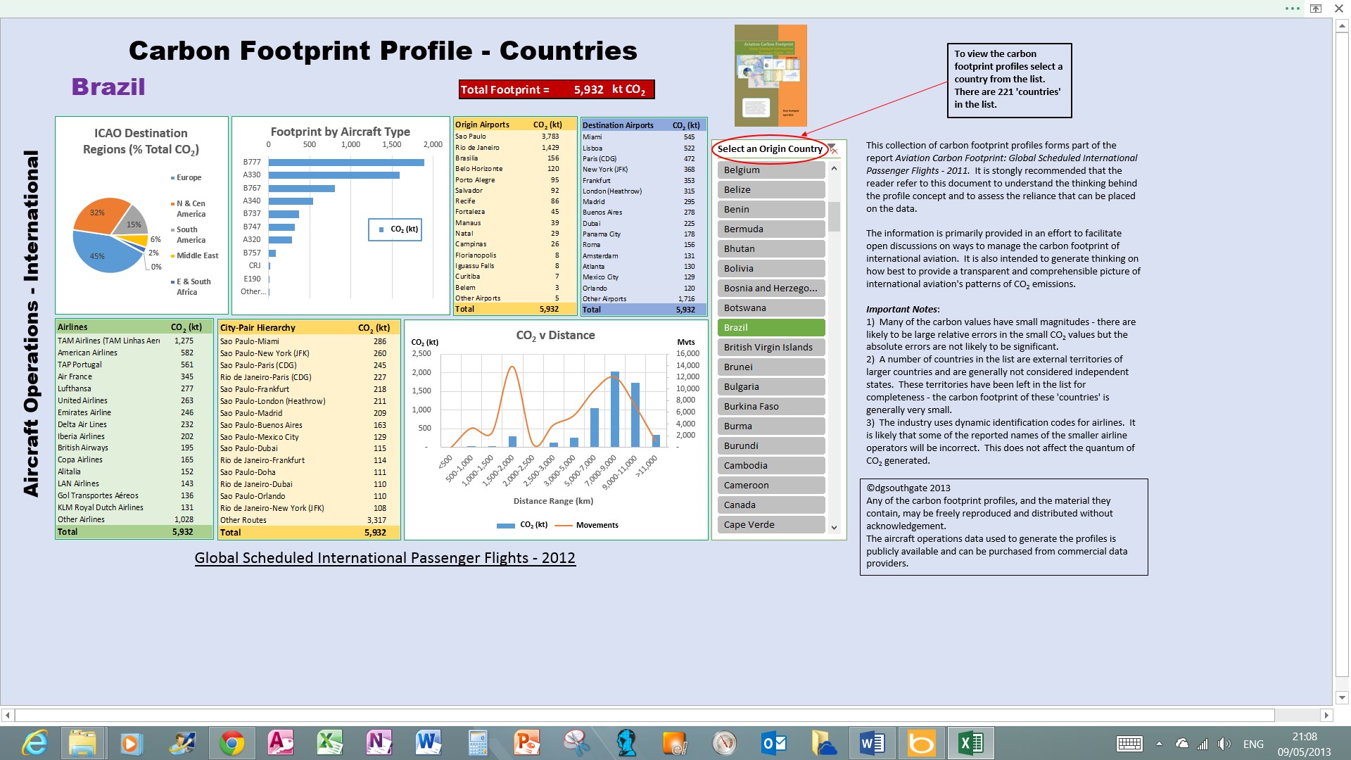 Today I’ve released three new tools which allow the user to generate carbon footprint profiles for global scheduled international passenger flights in 2012. I used this dashboard style concept to summarise carbon footprints throughout my book Aviation Carbon Footprint: Global Scheduled International Passenger Flights – 2012. The tools are simple applications which let the user generate ‘one click’ carbon footprint profiles for all the countries, airports and airlines which were in the database that I used to produce the book (221 countries, 1,274 airports and 492 airlines).